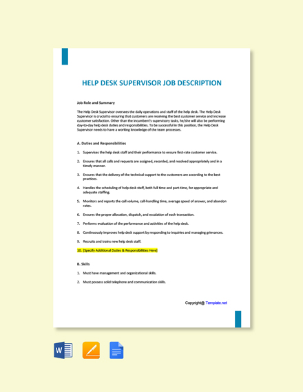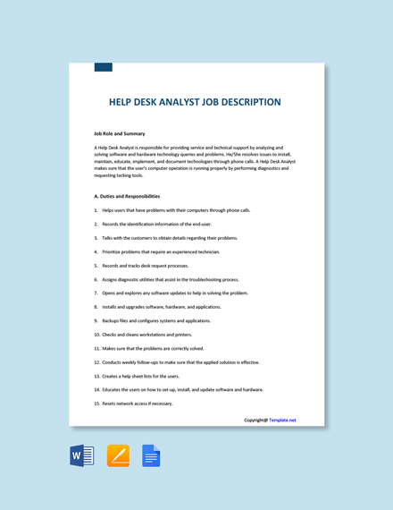 Help Desk Manager Job Ad/Description Template Free PDF - Word (DOC) | Google Docs from images.template.net A great job title typically includes a general term, level of experience and any special requirements. Help desk specialists provide technical support to clients experiencing computer hardware and software issues. Help desk job summary 1. The help desk job description applies to the generic help desk and service desk job function and can easily be revised to suit your specific needs. According to glassdoor, there are around 14,000 job vacancies for an it help desk professional in the us today with a salary averaging usd. Responsibilities include maintenance of it equipment throughout the environment, managing multiple customer requests simultaneously including troubleshooting of all it related equipment such as pcs, wireless handheld devices, thin clients. The pinnacle of your help desk experience so far (and the biggest regret of your life) was when you helped your to cast a spell on the recruiters, you must know how to describe your work history by creating the perfect help desk resume job description. Help desk technician ii, help desk tier 2 specialist.